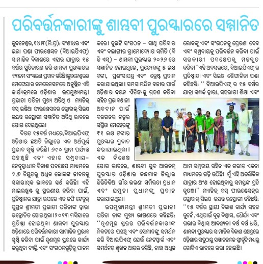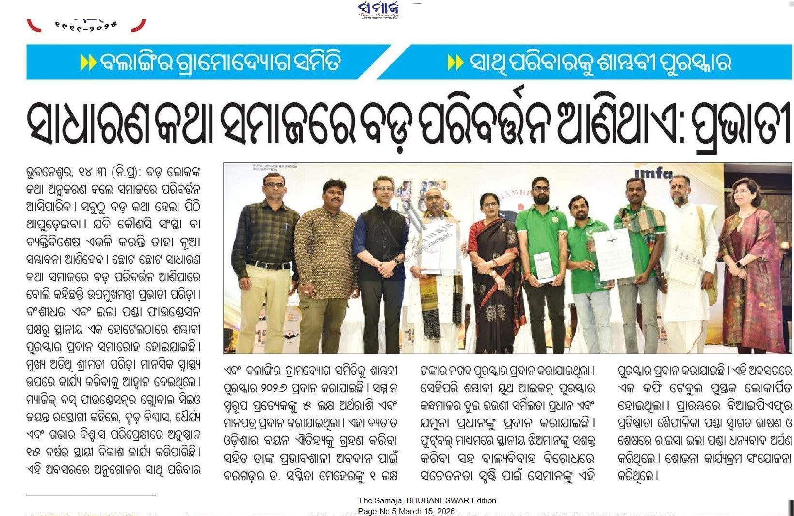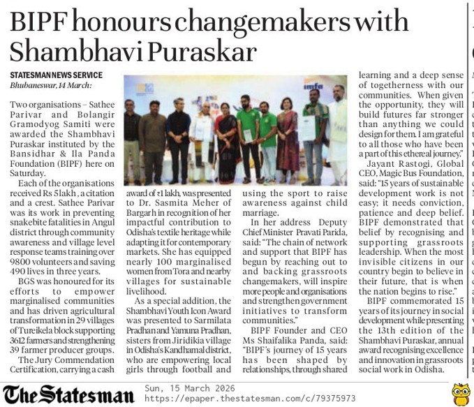 Shambhavi Puraskar 2024 , held on 03 May 2024 at Bhubaneswar Conferred upon Shri Ranjit Majhi and JCC recipient Smt Sasmita Managaraj.